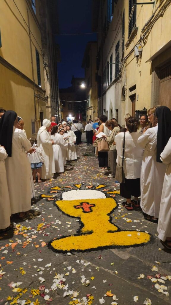 Un tappeto di fiori ha accolto i bambini della Prima Comunione e i fedeli che, in processione dalla Cattedrale di Pescia, sono arrivati alla Chiesa Monumentale di San Francesco accompagnati dalla Banda cittadina ‘Gialdino Gialdini’, dai Cavalieri dell’Ordine Equestre del Santo Sepolcro di Gerusalemme che hanno scortato il Santissimo custodito nelle mani di S.E. Mons. Tardelli Vescovo di Pescia, e con la partecipazione della Compagnia del SS. Crocifisso della Maddalena, e della Compagnia di Sant’Antonio di Colleviti.