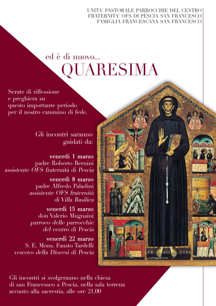 L’Unità Pastorale Parrocchie del centro di Pescia, la Fraternità dell’Ordine Secolare Francescano locale e la Famiglia San Francesco pesciatina hanno programmato una serie di incontri settimanali durante questo tempo di Quaresima.