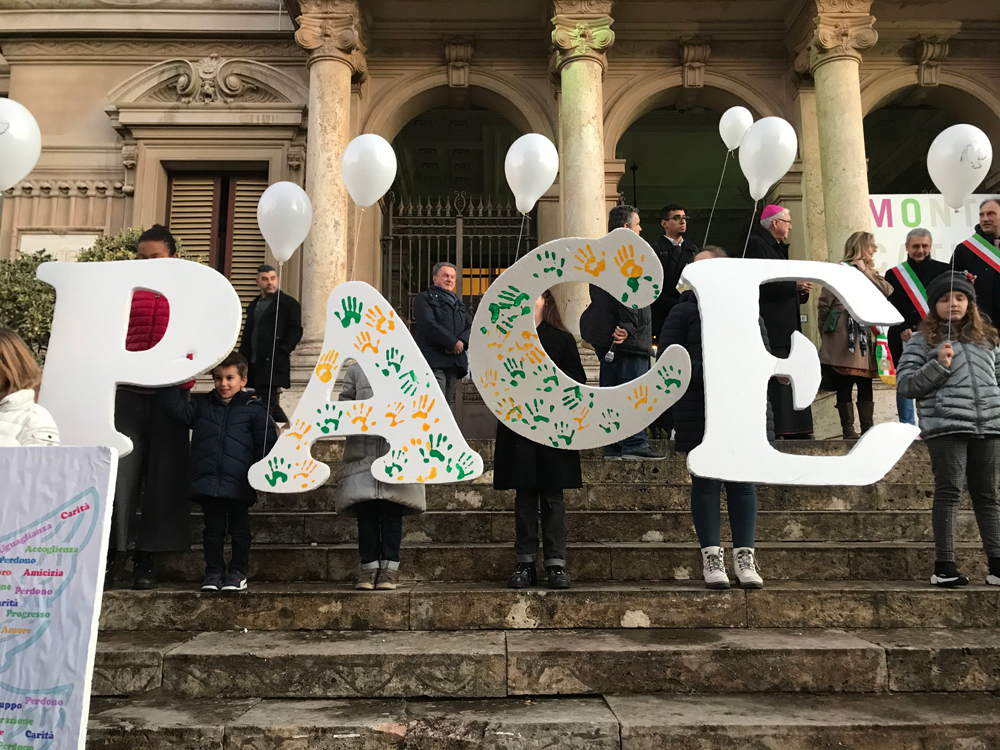 “La pace, cammino di speranza di fronte agli ostacoli e alle prove” è il tema del messaggio annuale del Papa per la giornata della pace, e come ormai da tre anni, sensibili ai temi espressi dal sommo Pontefice, l’Azione Cattolica, la Caritas e l’ufficio della Pastorale della Famiglia della diocesi, si sono fatti promotrici della marcia della pace a Montecatini Terme, il 5 gennaio 2020, dietro impulso di monsignor Vescovo, don Roberto Filippini. Quest’anno la marcia ha voluto caratterizzarsi come marcia dei popoli, nel momento liturgico che precede la festa dell’Epifania, quando i magi ed i pastori, quindi tutti i popoli, sono andati a rendere omaggio a Gesù. Proprio per questo motivo, sono state invitate a partecipare anche le numerose comunità di stranieri presenti sul territorio. La marcia è cominciata con il ritrovo alle ore 16:00 dei partecipanti davanti all’istituto San Giuseppe, ed a tutti i presenti è stato consegnato il messaggio del Papa, un piccolo segno per questo cammino significativo tra le strade di Montecatini, oltre che un palloncino raffigurante la colomba con un ramoscello d’ulivo, simbolo universale di pace e armonia. Il corteo si è incamminato verso il palazzo comunale, alternando canti alla lettura di testi significativi sul tema della pace, da Madre Teresa a Martin Luther King. Arrivati al palazzo comunale intorno alle 16:45, il vescovo ha salutato i sindaci dei comuni della Valdinievole presenti, consegnando loro il messaggio del Papa, a testimonianza di come la pace sia un tema che va al di là di qualsiasi colore politico. Nelle sue parole ai sindaci e alle persone presenti, il vescovo ha voluto sottolineare come questa marcia sia una «goccia in questo mare di conflitti, di contraddizioni, ma che vogliamo far giungere a tutti gli uomini di buona volontà». Ringraziando gli amministratori locali presenti, il vescovo ha voluto ricordare ancora come il giorno della pace, fissato al primo gennaio di ogni anno, abbia proprio il senso di dedicare a questo importante tema il «tempo nuovo che ci è donato, cosicché si illumini con questa fiamma che è la pace». Parlando del messaggio della pace, scritto da Papa Francesco dopo il suo viaggio in Giappone, ha fatto notare come «il cammino della pace non può essere come camminare sempre sull’orlo del baratro, come purtroppo la logica umana per molto tempo sembra proporre. La pace non si costruisce con la guerra, che genera solo guerra. Dalla guerra si ottiene solo dolore, violenza, morte. Il Papa ci propone di sostituire questa logica con la logica della fratellanza, che davvero è nel nostro d.n.a, come impronta del Creatore, in un ascolto reciproco fatto con amore e pazienza».