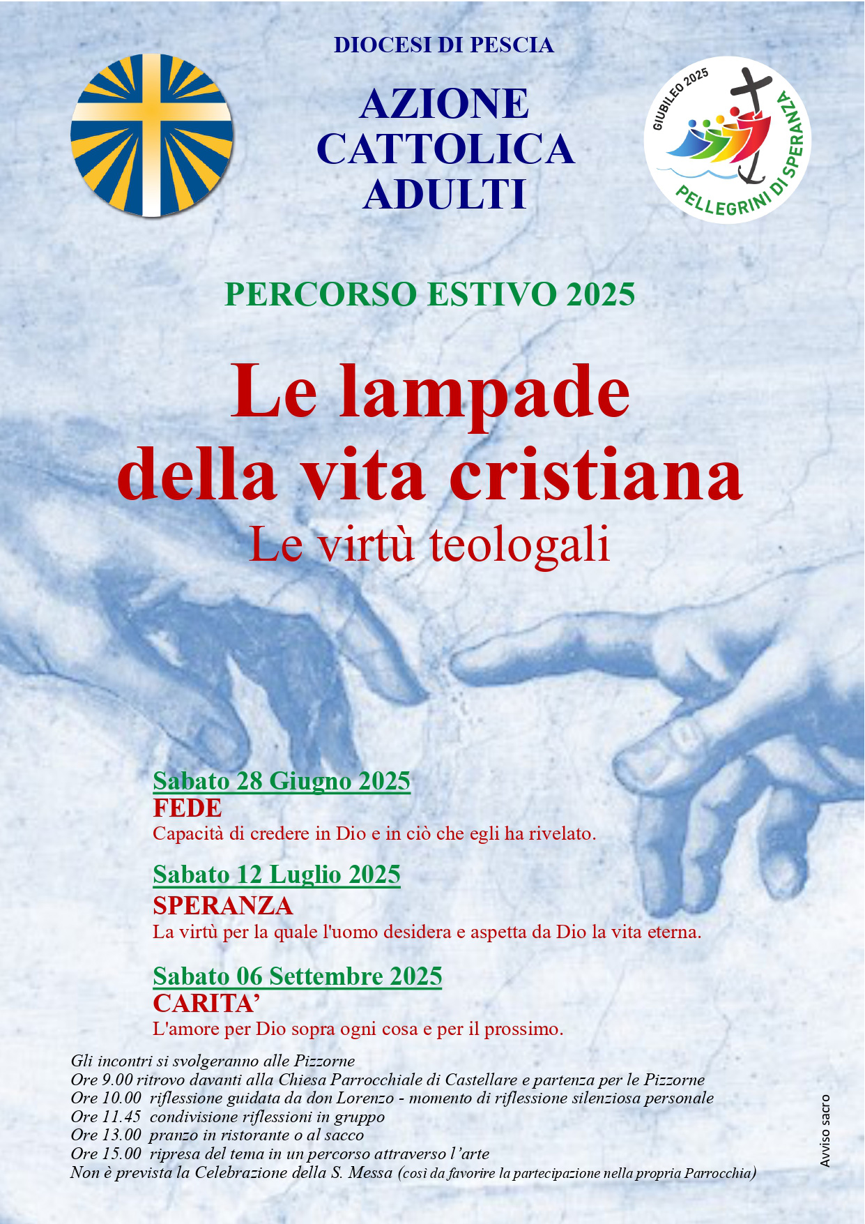 Al fresco delle colline di Pescia, nelle Pizzorne, l’azione cattolica adulti si è ritrovata il 28 giugno per il primo di tre incontri estivi dedicato alle virtù teologali, fede speranza, carità. Perché un ciclo di incontri su questo tema? Perché, come ci ha ricordato don Lorenzo, si è dato spazio a tantissime cose, ma abbiamo lasciato da parte quelle che sono le verità di fede. “quando noi incontriamo qualcuno che ci chiede ragione della speranza che è in noi, pensiamo subito come risposta ad un brano della scrittura, ma difficilmente riusciamo a fare riflessioni un po’ teologiche.” Ecco perché un ciclo di incontri per riprendere “l’ossatura” della nostra fede. Don Lorenzo all’inizio ha evidenziato come la fede sia un atto complesso che coinvolge ragione, volontà e affettività, e si manifesta come fiducia in Dio, obbedienza, riconoscimento delle sue opere e comunione con Lui. È un dono gratuito di Dio, che richiede la sua iniziativa per essere accolta. La fede cristiana si distingue dalle virtù umane (prudenza, giustizia, fortezza, temperanza), che già avevano trovato spazio nella cultura “pagana2, perché si basa sulla rivelazione soprannaturale e ha Dio come oggetto.