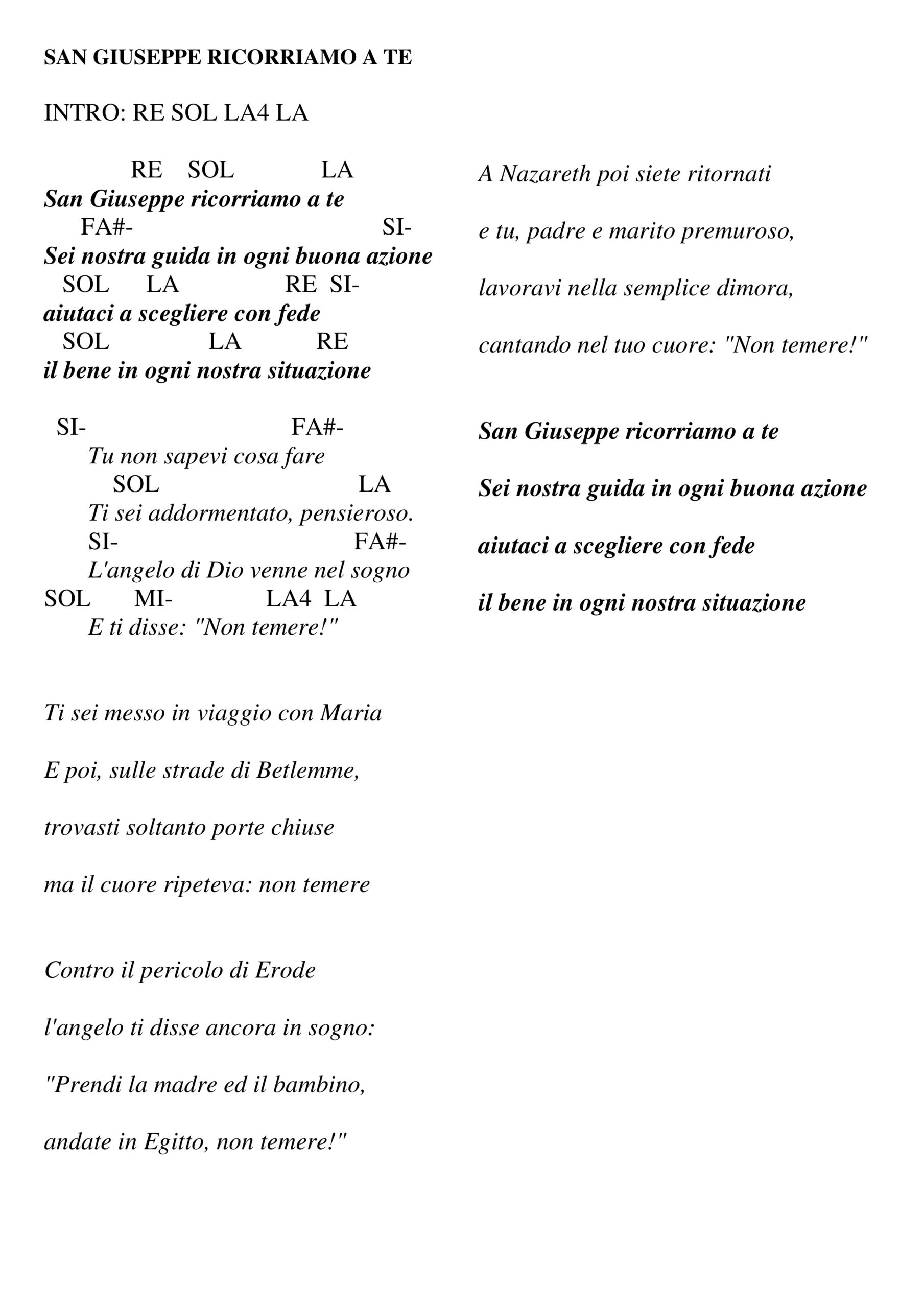 Quando mi è stato chiesto di comporre un canto adatto a questa occasione, mi sono ricordata che un anno fa, in pieno lockdown, suor Gabriela Psja, conosciuta da tutti come suor Gabi, delle suore Giuseppine di Montecatini, mi aveva fatto ascoltare un canto dolcissimo da lei composto in occasione del 19 marzo, festa di San Giuseppe: con la sua approvazione, ho cercato di modificare il testo, che in quel momento sottolineava soprattutto la drammaticità del momento che stavamo vivendo, ovvero l’esplosione del contagio da Covid 19 anche in Italia. È vero che, trascorso un anno, siamo nella medesima situazione di paura, malattia e restrizione nelle relazioni sociali, ma il canto è diventato più adattabile ad ogni situazione di vita. Mi ha aiutato confrontarmi con l’amico Marco Paoli, con il mio parroco don Gianni, con mio marito Giovanni: il vescovo Roberto ha voluto darmi suggerimenti davvero preziosi, per giungere infine ad un testo che, pur rimanendo nella traccia pensata da suor Gabi, fosse rispettoso della storia di questo Santo e adattabile alla melodia. Ecco che San Giuseppe è nostra “guida” nella scelta di compiere buone azioni, ci aiuta nel discernimento in ogni situazione difficile, per saper vedere il “bene” anche dove non riusciamo a vederlo. Nelle strofe, vengono accennate le vicissitudini della vita di Giuseppe, che è stato accogliente verso Maria, padre tenero e premuroso, obbediente al volere di Dio, coraggioso e creativo nel proteggere la sua famiglia, un uomo che con il suo umile lavoro ha permesso al Figlio di Dio di crescere e farsi uomo, a Maria di vivere al sicuro, custodendo nel cuore il mistero della sua chiamata.