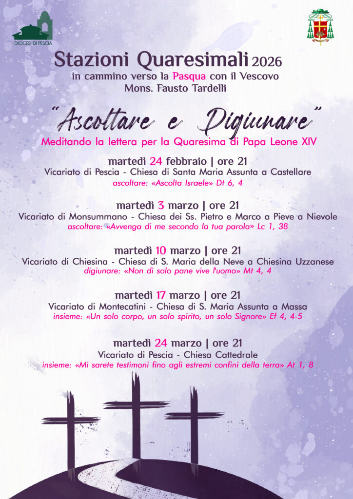 3 Novembre 202517 Febbraio 2026V Stazione Quaresimale – vicariato di Pescia, chiesa CattedraleInsieme: «Mi sarete testimoni fino agli estremi confini della terra» At 1,8 martedì 24 Marzo Descrizione: . Inizio: 24/03/2026 21:00 Fine: 24/03/2026 22:00 Categorie: Calendario Pastorale Indirizzo: Via Giusti, 51017 Pescia Ricciano, Toscana Italia Paese: Italia V Stazione Quaresimale - vicariato di Pescia, chiesa CattedraleVia Giusti, 51017 Pescia Ricciano, Toscana Italia condividi su